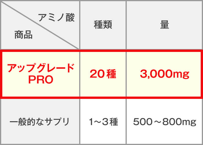 アミノ酸は成長ホルモンの分泌を促進してくれるので、成長期を迎える中高生の栄養補給には欠かせません。アスリートの間ではカラダづくりの基本とされていて、コンディションの調節や、リカバリー促進等、身体をトータルサポートしてくれます。特にスポーツをしている人は、アミノ酸の消費量も多いので積極的に摂る必要があり、アップグレードPROにはそれが20種類も入っているので、驚きです。